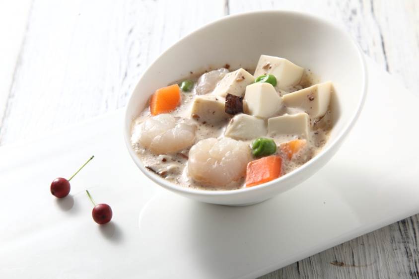 步驟: 焯好水的豆腐、蝦仁、香菇、青豆、胡蘿卜放入盤子加上色拉醬拌勻即可。